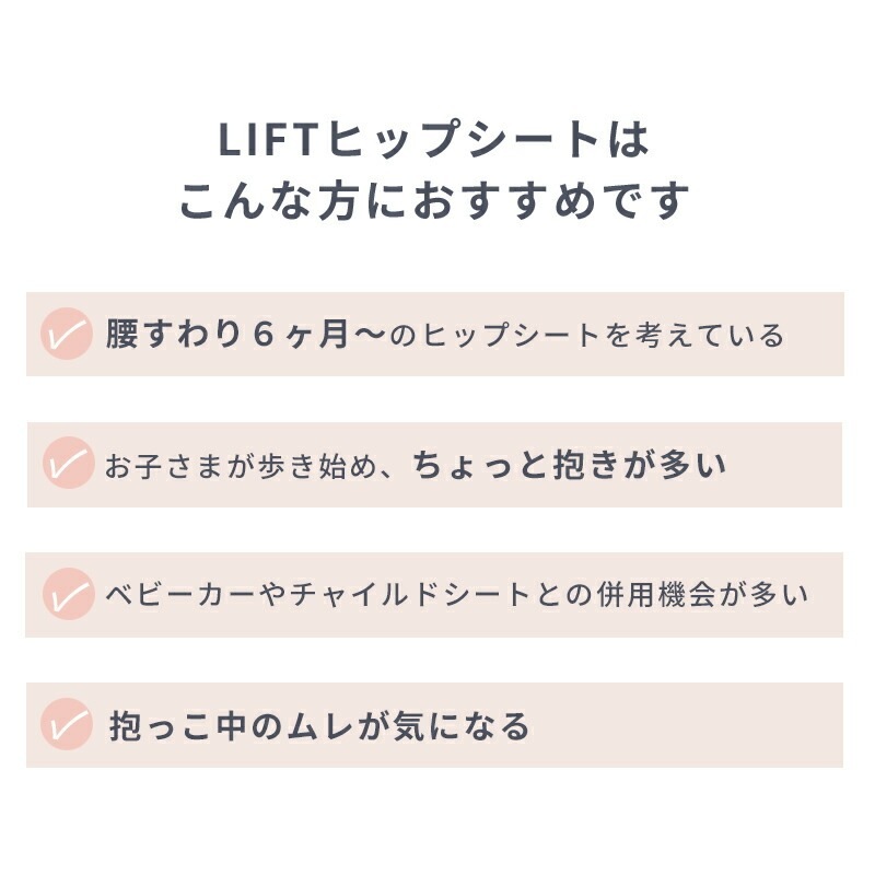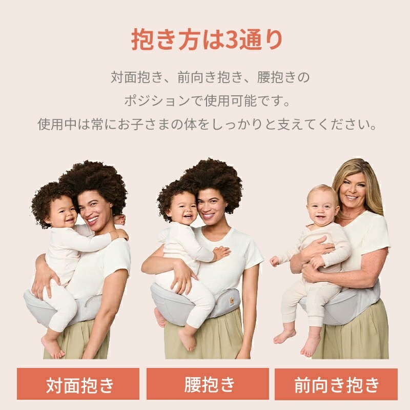 Lift(リフト) ヒップシート 乗せ降ろしが増えても、ヒップシートで手軽に抱っこ。 クッション付きのシートがお子さまを快適な姿勢で支えます。 取扱説明書の保証規定に基づき、1年間の製品保証をいたします。 保証期間中にユーザー登録をしていただくことで、保証期間が2年間に延長されます。 【製品特徴】 ■国際股関節異形成協会(IHDI)認定製品 ■人間工学に基づいたシート滑り止めとクッション性のあるシートが、お子さまの自然な座り姿勢をサポートします。 ■サッと装着できるウエストベルトバックルを留めるだけのシンプルな設計。着脱テープがないため、大きな音を立てず簡単に付け外し可能。お子さまが眠った後の抱きおろしもスムーズです。 ■2カ所のポケット前面とサイドの2カ所にポケットがあり、お出かけ時も便利。 ■授乳や寝かしつけ補助にもお出かけだけでなく、授乳や寝かしつけ時の様々なシーンで大活躍。 当店のエルゴベビーはメーカー保証がついた国内正規品です。 ※ベビージャクソンズストアは正規販売店です。 ■ブランド:エルゴベビー ■対象:腰がすわった生後6カ月(体重7.8kg)から体重20.4kgまで ■素材:表地・裏地:ポリエステル100%、シート芯材:発砲ポリプロピレン ■ウエストサイズ:ウエストベルトの長さ 63.5cm~137cm ■生産国:ベトナム ■付属品:取扱説明書、保証カード ■お手入れ ヒップシートから芯材を取り出し、洗濯機(洗濯ネット使用)でお手入れ可能です。 芯材は固く絞ったぬれタオル等で拭いてください。 |