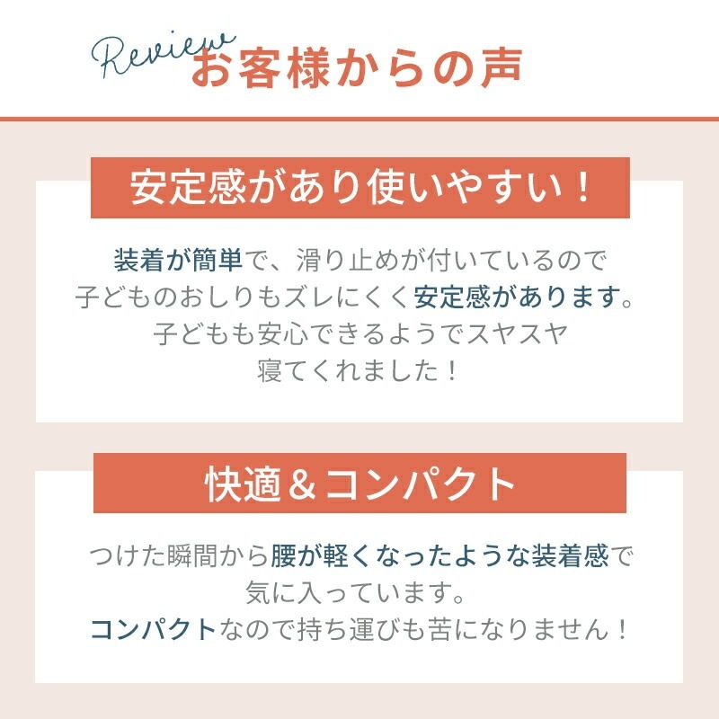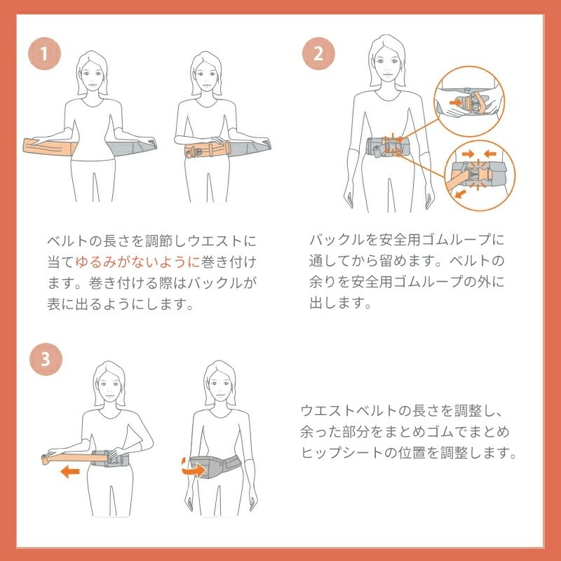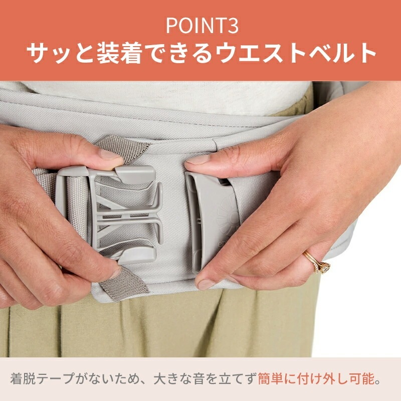 ■サッと装着できるウエストベルトバックルを留めるだけのシンプルな設計。着脱テープがないため、大きな音を立てず簡単に付け外し可能。お子さまが眠った後の抱きおろしもスムーズです。