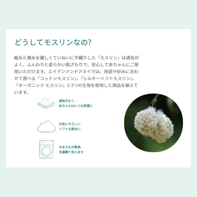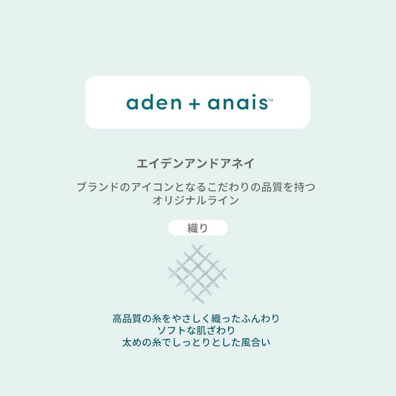 通気のよい柔らかい生地が赤ちゃんのお肌を優しく包みます。 大判サイズなのでよだれや食べこぼしをしっかりキャッチし、ダブルガーゼ3層構造で適度な厚みと吸水性があります。成長に合わせてスナップで調整ができ、着脱も簡単です。洗い替えに便利な3枚セット。 aden + anais(エイデンアンドアネイ)を代表するコットンモスリン素材を使用したスナップビブ(よだれかけ)です。 コットンモスリンは、通気の良い細かな織りが特長。厚手で吸水しやすいため、赤ちゃんの繊細なお肌をやさしく包み込みます。 大判サイズで、よだれや食べこぼしをしっかりキャッチ。よだれの多いお子さまはもちろん、お食事エプロンとしても活躍してくれます。 ダブルガーゼ3層構造になっており、適度な厚みと柔らかさがあります。 お洗濯の洗い替えにも便利な3枚セットです。 ■ 成長に合わせて3段階にサイズ調整可能 ■ スナップボタンで取り付け・取り外しも簡単 ■ よだれや吐き戻しをしっかりカバー ■ 洗濯機で洗えて乾きやすい ※タンブラー乾燥はお避けください ■ ダブルガーゼ3層構造/ダブルガーゼ3層構造で、適度な厚みと柔らかさがお肌にやさしい/大判サイズでよだれや食べこぼしをしっかりキャッチ/スナップでサイズ調整可。洗濯機で洗えて便利な3枚セット /※商品により柄の出方が異なる場合がございます。 ※お使いのモニターにより、実際のものと色が異なる場合がございます。 ■ブランド:aden + anais(エイデンアンドアネイ) ■サイズ:W23×D34cm (首回り26-29cm) ※製造の都合により、サイズには若干の誤差が生じる場合がございます。 ■素材:コットン100% ■製造国:中国 |